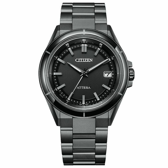 ブラックチタン?のケース、バンドと、モノトーンで統一された文字板が、エレガントな高級感を演出。シンプルな文字板ながら印象的なデザインに仕上げています。