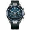 シックな印象を与えるブルーのサファイアベゼル。シルバー、ブラック、ブルーを使い分けたケースと文字板が、精悍な印象に仕上げています。腕にフィットしやすいウレタンバンドは、このモデルのために開発した仕様です。