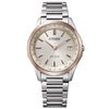 トレンドカラーを取り入れた、シンプルでありながらもメリハリのあるデザイン。ベージュ色の文字板がクラシカルで落ち着きのある印象を与えます。透明感のあるライトシルバー色のケースとバンド、サクラ色のベゼルを配したツートーンデザインが、ひときわエレガントな雰囲気を演出します。